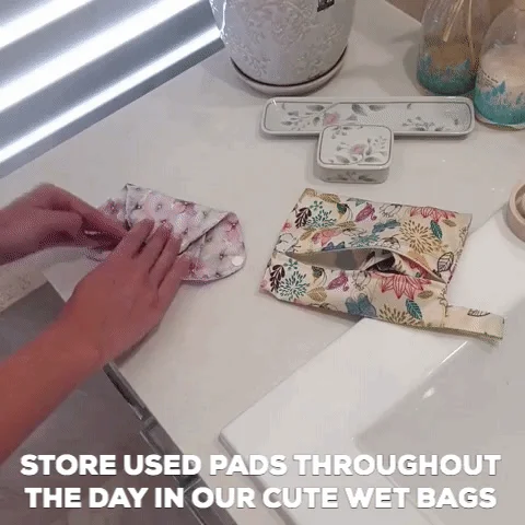 Fold the pad over itself and snap it shut with the buttons, you can choose to rinse before or not (depending on your location/circumstances) and insert into the wet bag. Folding the pads this way and also using our wet bag will ENSURE there are no leaks or smells.